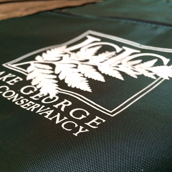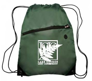 13.5" X 18", green with LGLC logo screen printed in white. Durable 210 denier polyester bag with spacious main compartment and drawstring closure. Includes a front zippered pocket and built-in slot for earphones. Reinforced eyelets and reliable shoulder straps.