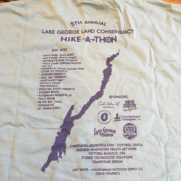 The fifth Hike-A-Thon shirt for our annual blockbuster event.  Show your love of the lake while wearing this soft blue shirt with a special 5th Anniversary logo on front. Back has the lake silhouette, list of participating event sites, plus sponsors.