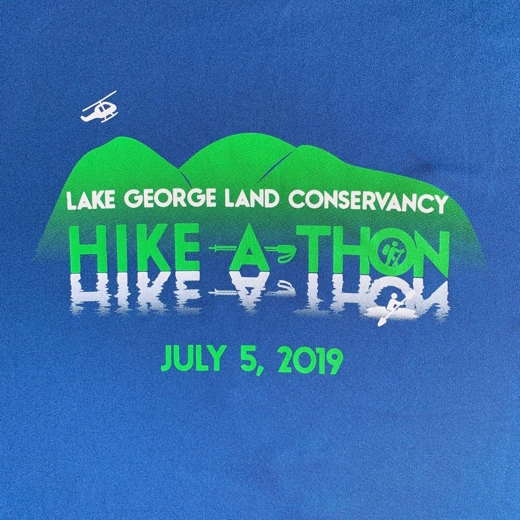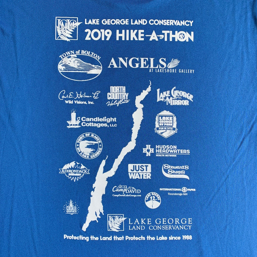 The 7th Hike-A-Thon shirt for our annual blockbuster event. Two-color screen print on front shows the mountains and water with a hiker and a kayaker, and the event's iconic helicopter. Sponsors and lake silhouette printed on the back.