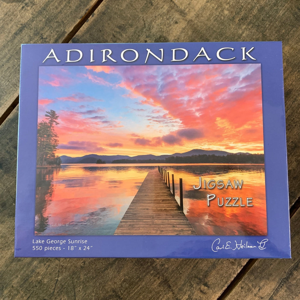 Lake George Sunrise: 18"x24" puzzle featuring a brilliant sunrise and dock on Lake George. 550 puzzle pieces.